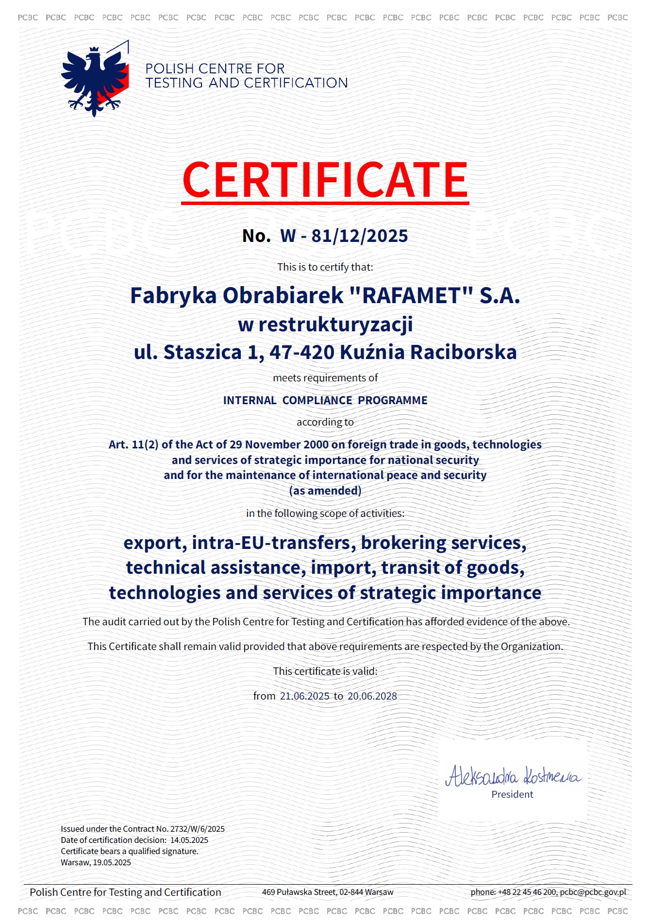 The fulfillment of the Internal Control System's (WSK) criteria, which are acknowledged by the certificate of the Polish Center for Testing and Certification (Polskie Centrum Badań i Certyfikacji), guarantees an appropriate classification of goods and services, as well as proper safety measures and a transparency of transactions and their adequate recording, thus increasing international safety and maintaining peace.